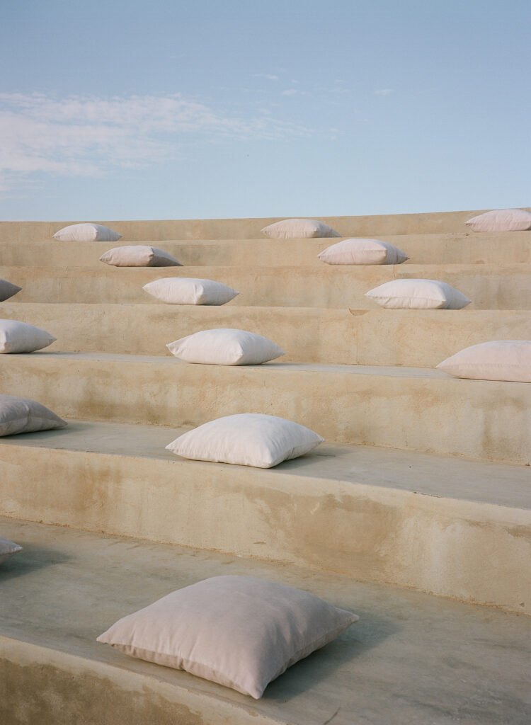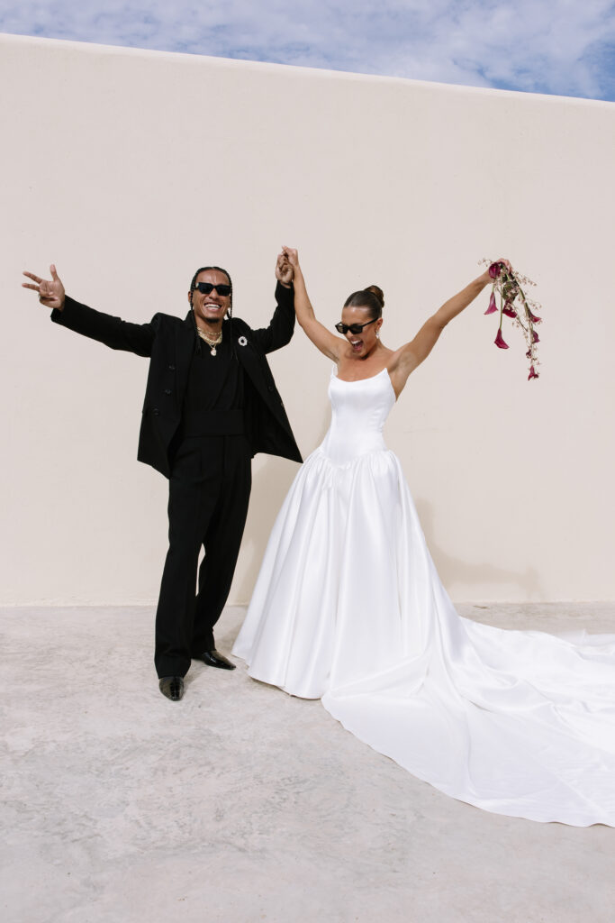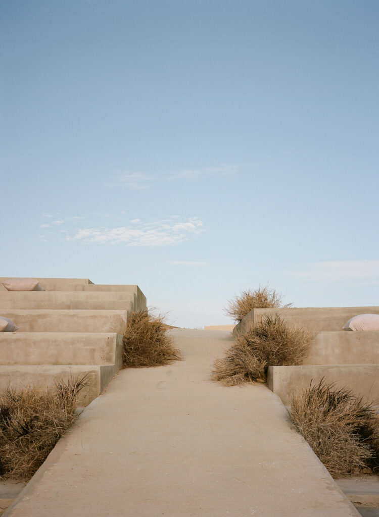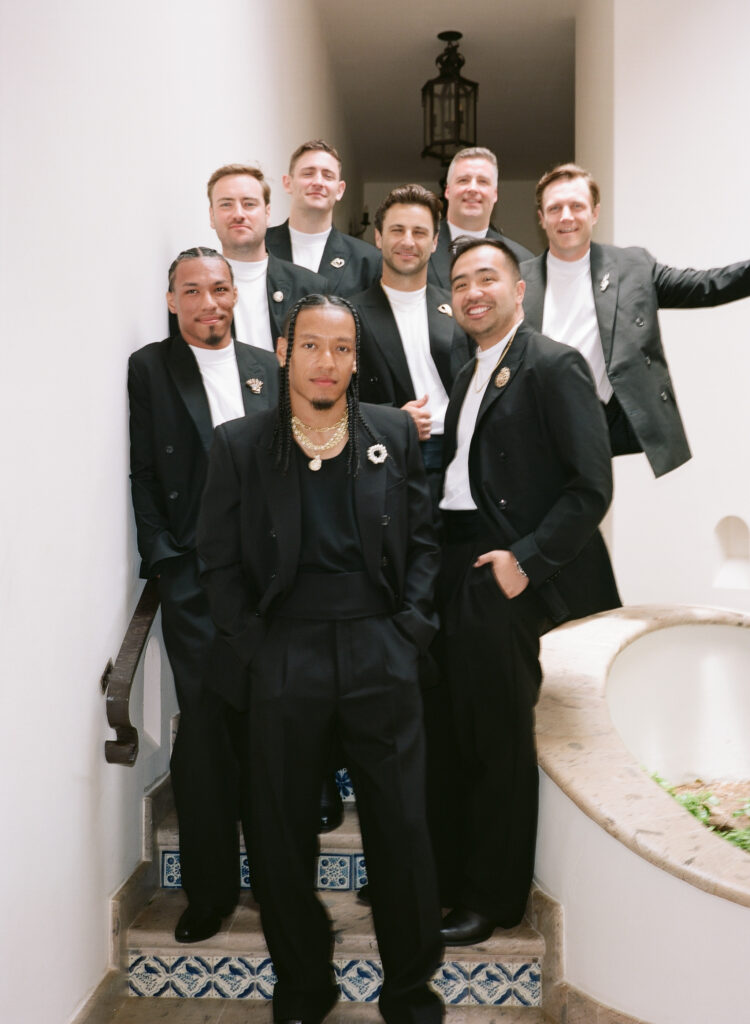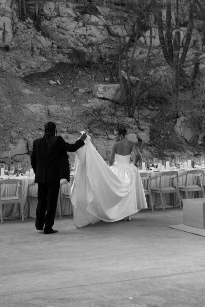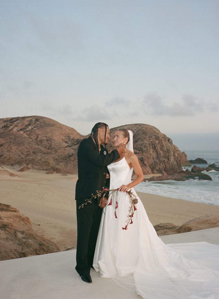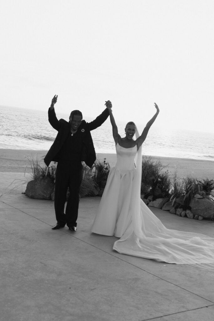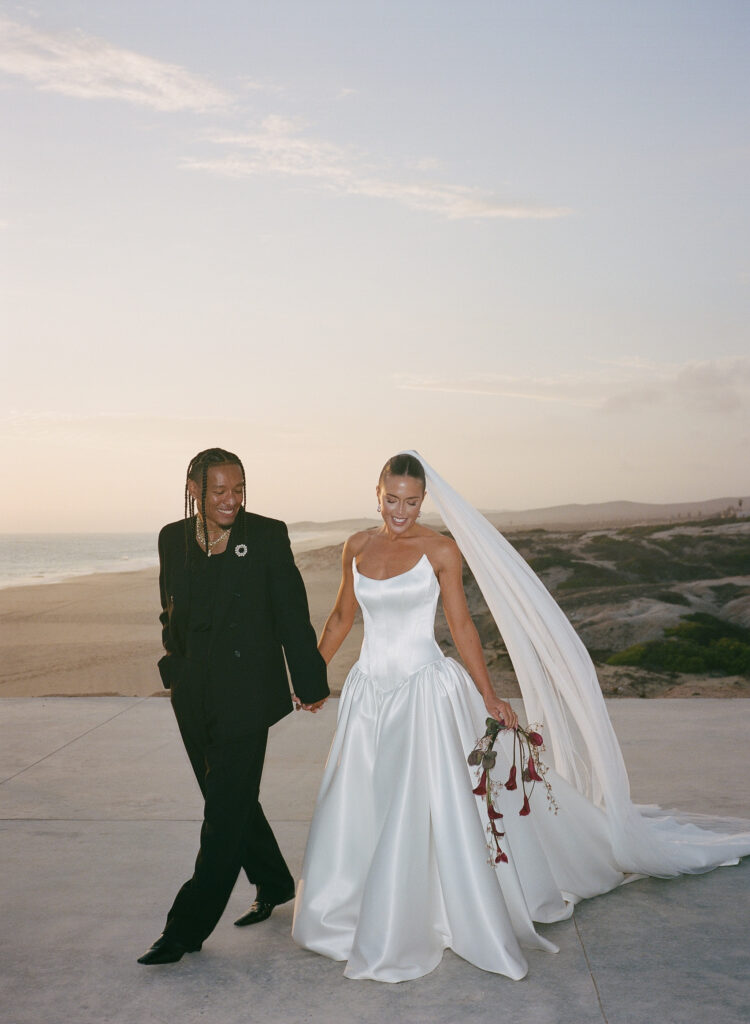 Inspired by the Fear of God fashion show at the Hollywood Bowl in 2023, the couple borrowed from its moody color palette and amphitheater ambiance, drawing a subtle parallel to their ceremony site, The Risk, which echoed the same grandeur and intimacy. The aesthetic was intentionally minimal— earth tones, natural textures, and quiet elegance, allowing the raw beauty of Cabo’s landscape to take center stage.