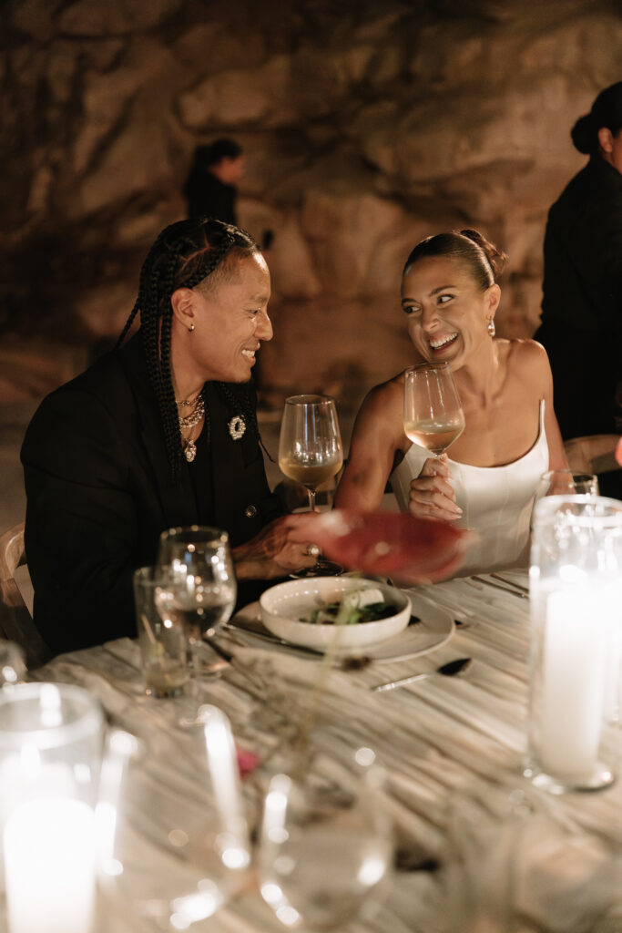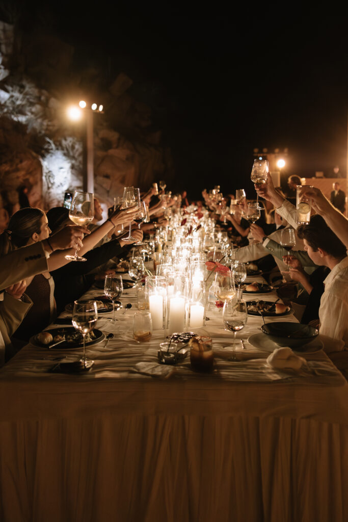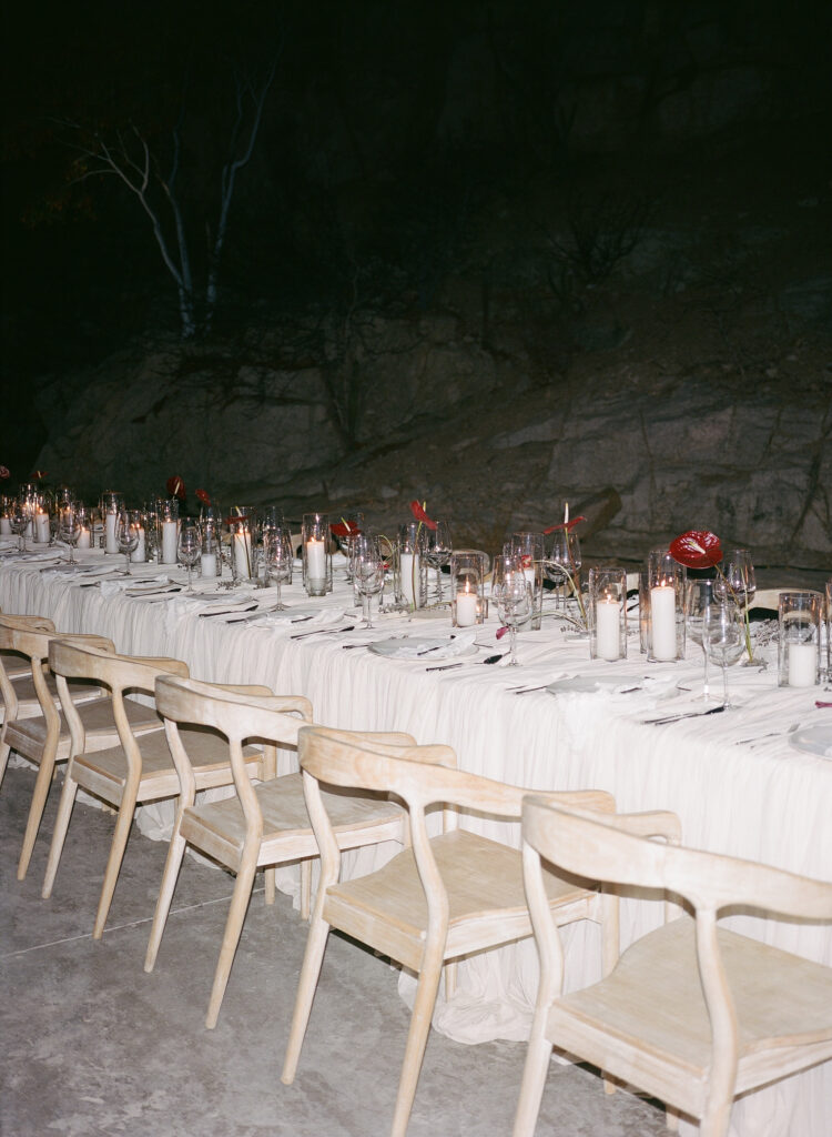 They wanted the day to unfold like chapters in a novel, with each location transporting guests to an entirely new setting. A 15-minute drive down a winding dirt road opened onto a breathtaking, secluded ceremony site. Later, guests were whisked down another rustic path to a canyon carved in stone for an ethereal reception– intimate, expansive, and profoundly private. The venues were kept secret until the last moment, preserving the wonder and ensuring that only invited guests were privy to the experience.