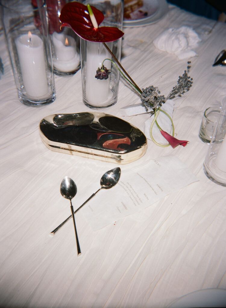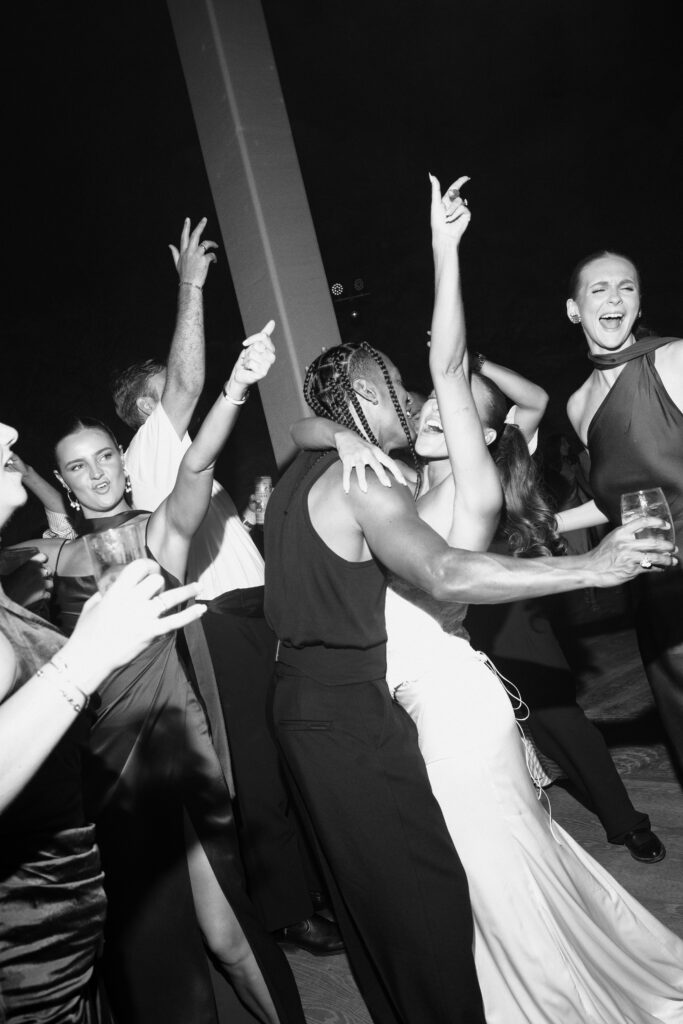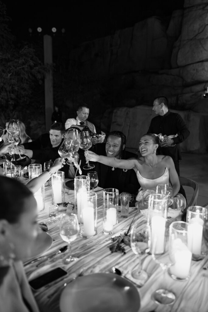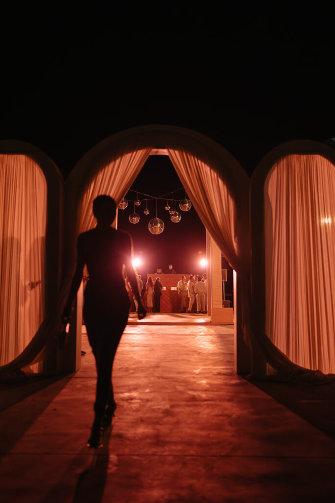 Lighting was a carefully orchestrated element throughout the evening. From golden hour to dinner to the high-energy dance floor, the lighting shifted with the mood– warm and moody, then vibrant and alive. Hundreds of candles lit the venue, lending an organic, intimate glow that was never harsh, always intentional.