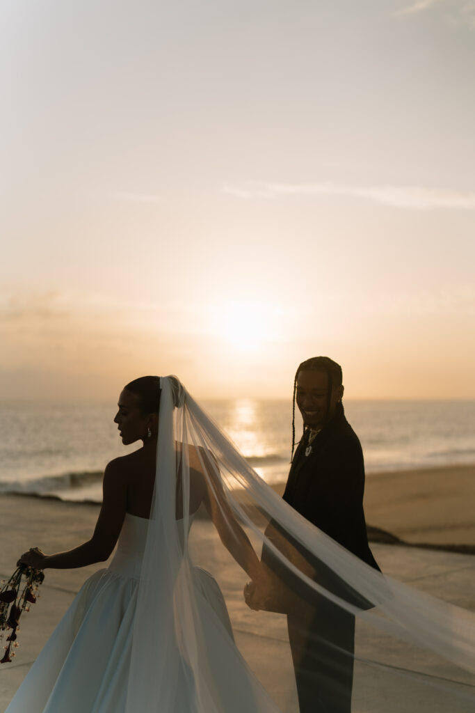 The water held deep significance for the couple. From their first home together overlooking Boston Harbor to falling in love with LA on a visit to El Matador Beach. Now locals, they end every week watching the sunset on the Pacific. It was only fitting, then, that they wed during golden hour.